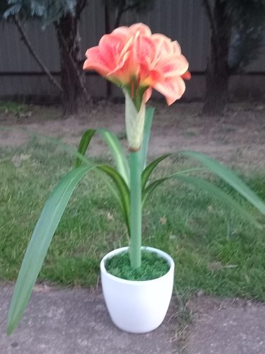 Élethű amarillisz fehér kerek kerámia kaspóban, csodaszép barackszínű virággal ékeskedik, 55 cm magas.