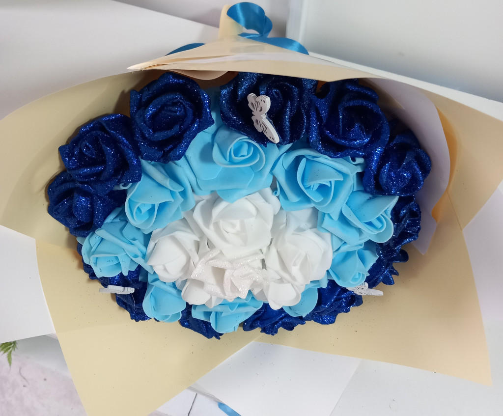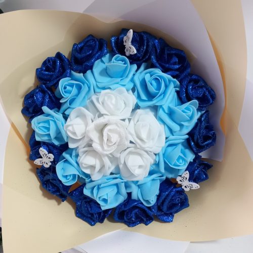 Örökrózsa csokor világoskék habrózsából, csillogós sötétkék rózsából és fehér habrózsából készült, pillangóval díszítve.