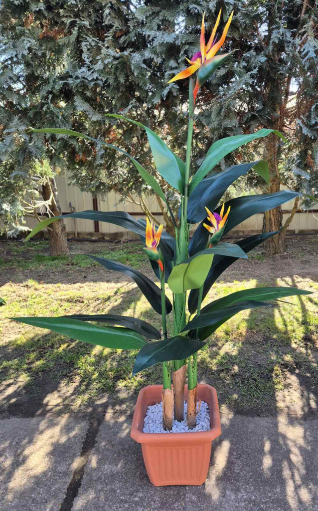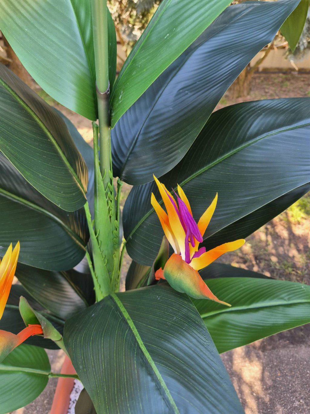 Élethű papagájvirágfa, csodaszép virággal. 140 cm magas.