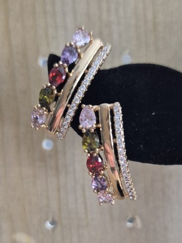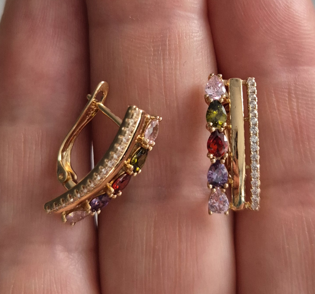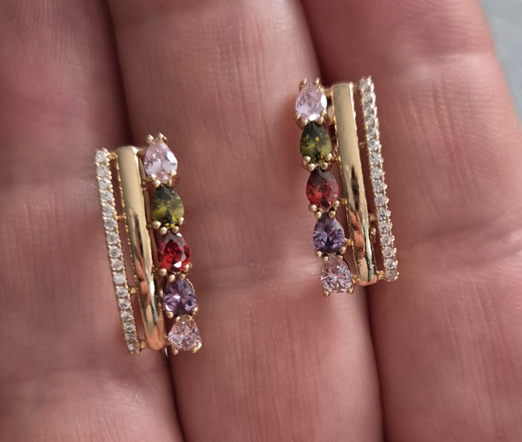 Antiallergén nemesacél arany színű fülbevaló színes kövekkel díszített. 17 mm a hossza.