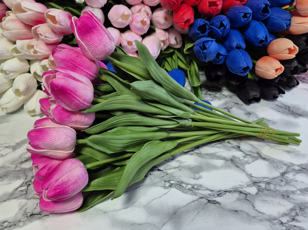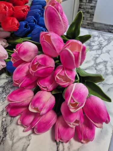 Szálas élethű gumitulipán, hófehér-rózsaszín színben. 34 cm hosszú.