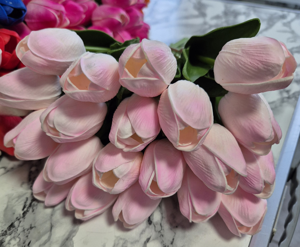Szálas élethű gumitulipán, hófehér-halványrózsaszín színben. 34 cm hosszú.