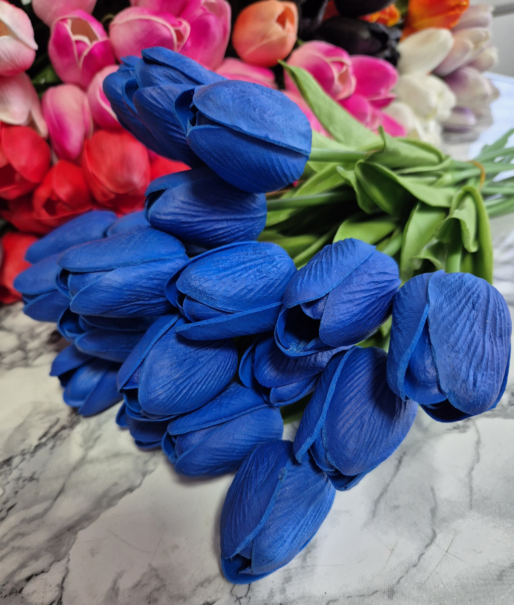 Szálas élethű gumitulipán, királykék színben. 34 cm hosszú.
